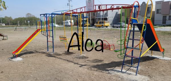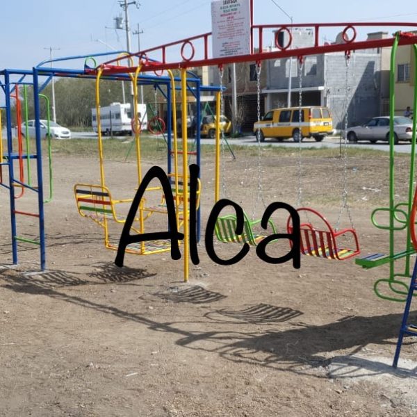 Torre de base en U con 4 columpios de suela y resbaladero de fibra